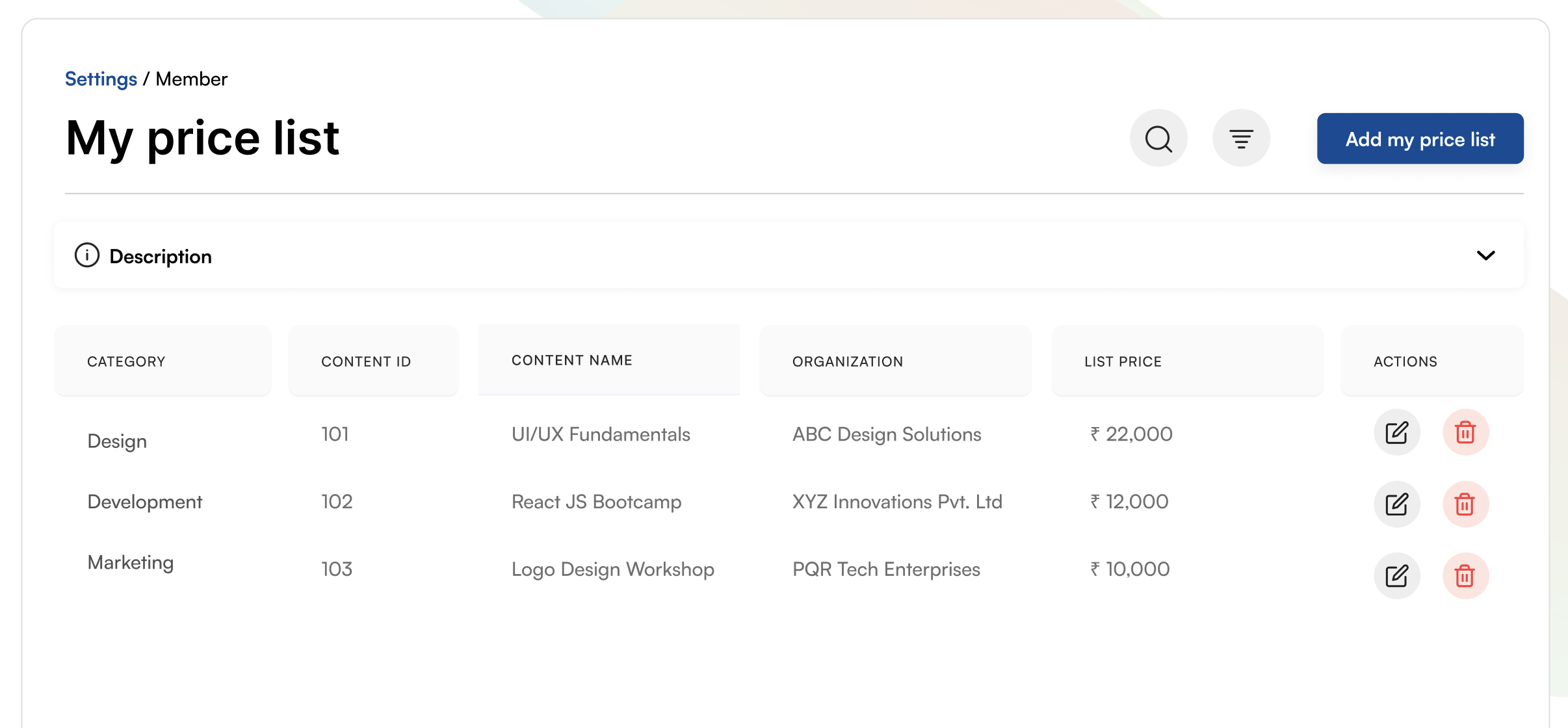 Create and manage organization-specific pricing for different clients. Set category-based prices, track content IDs, and maintain complete control over your pricing strategy with quick edit capabilities.